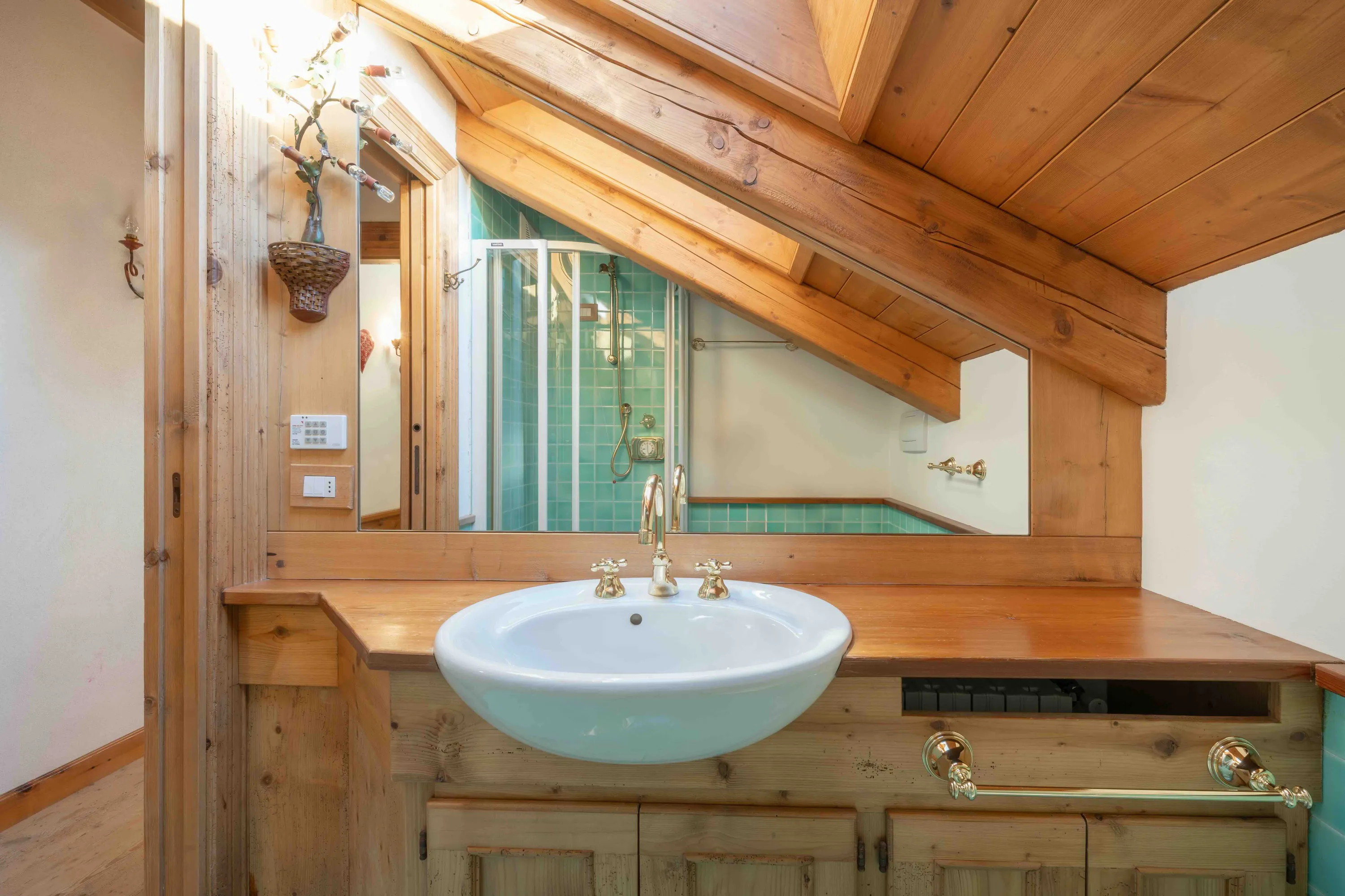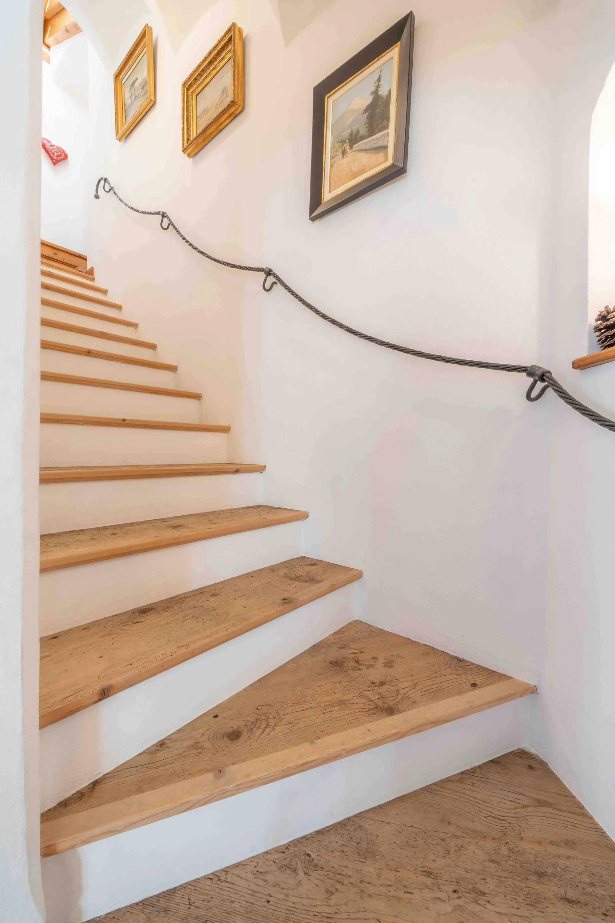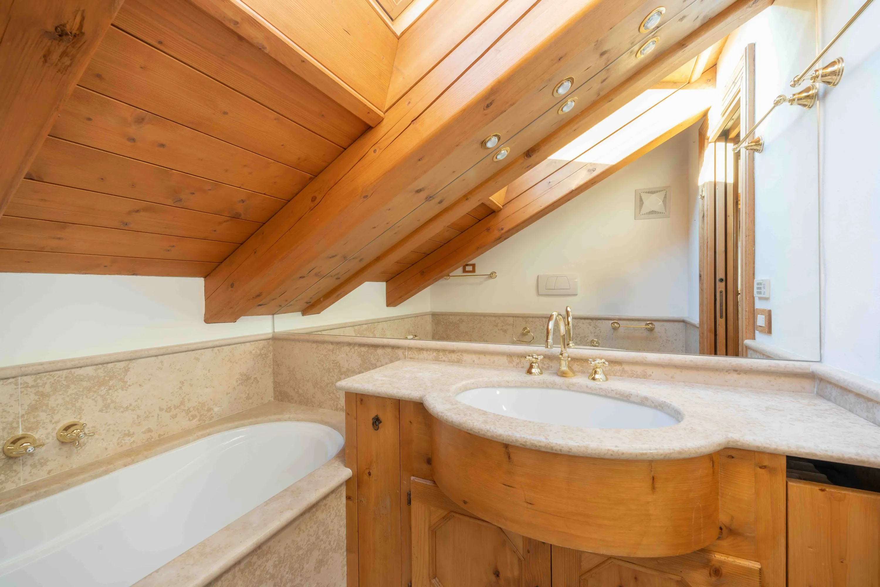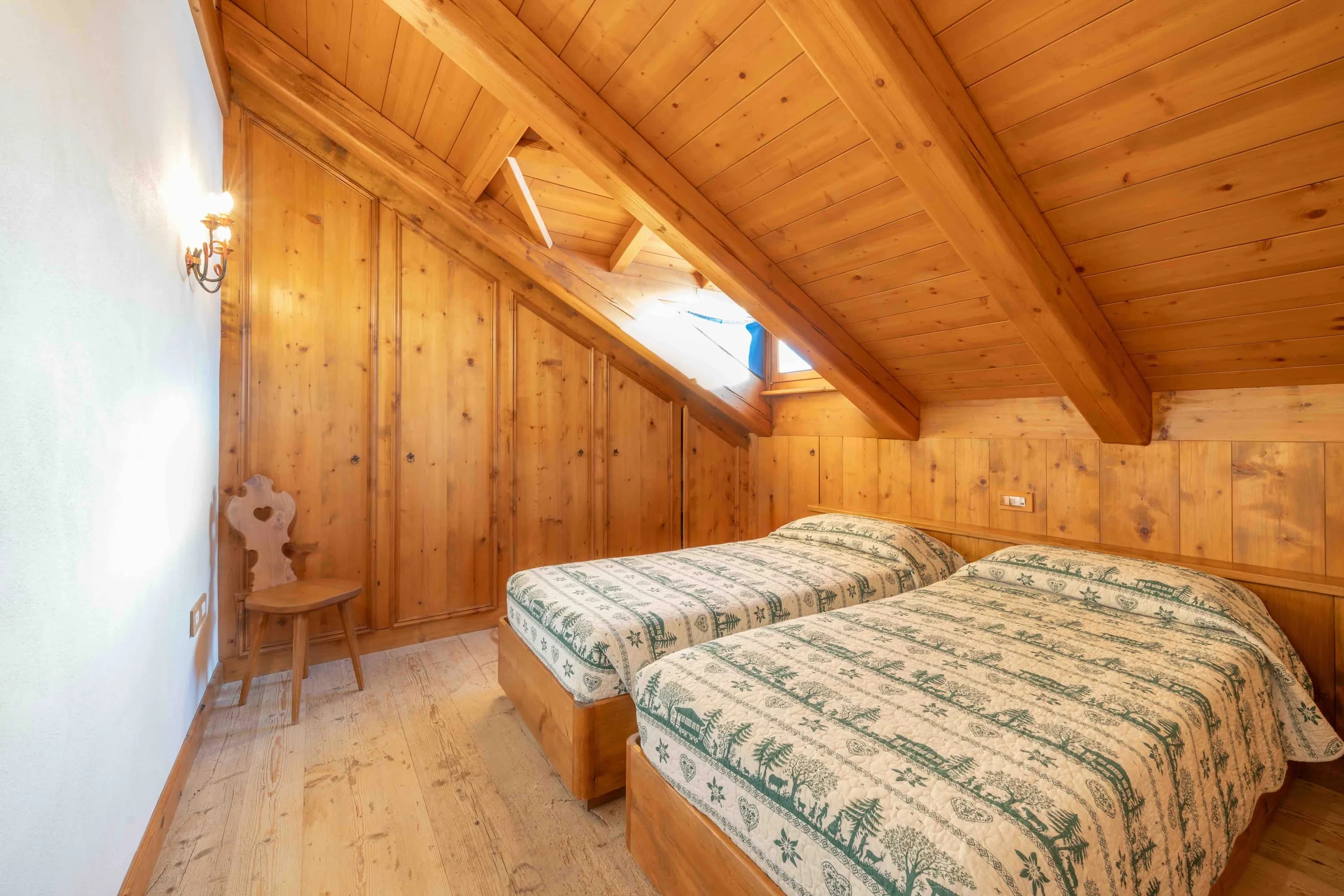 In una tipica casa ampezzana ristrutturata, l’appartamento si trova al primo piano ed è disposto su due livelli, combinando il fascino dell’architettura tradizionale con comfort moderni.