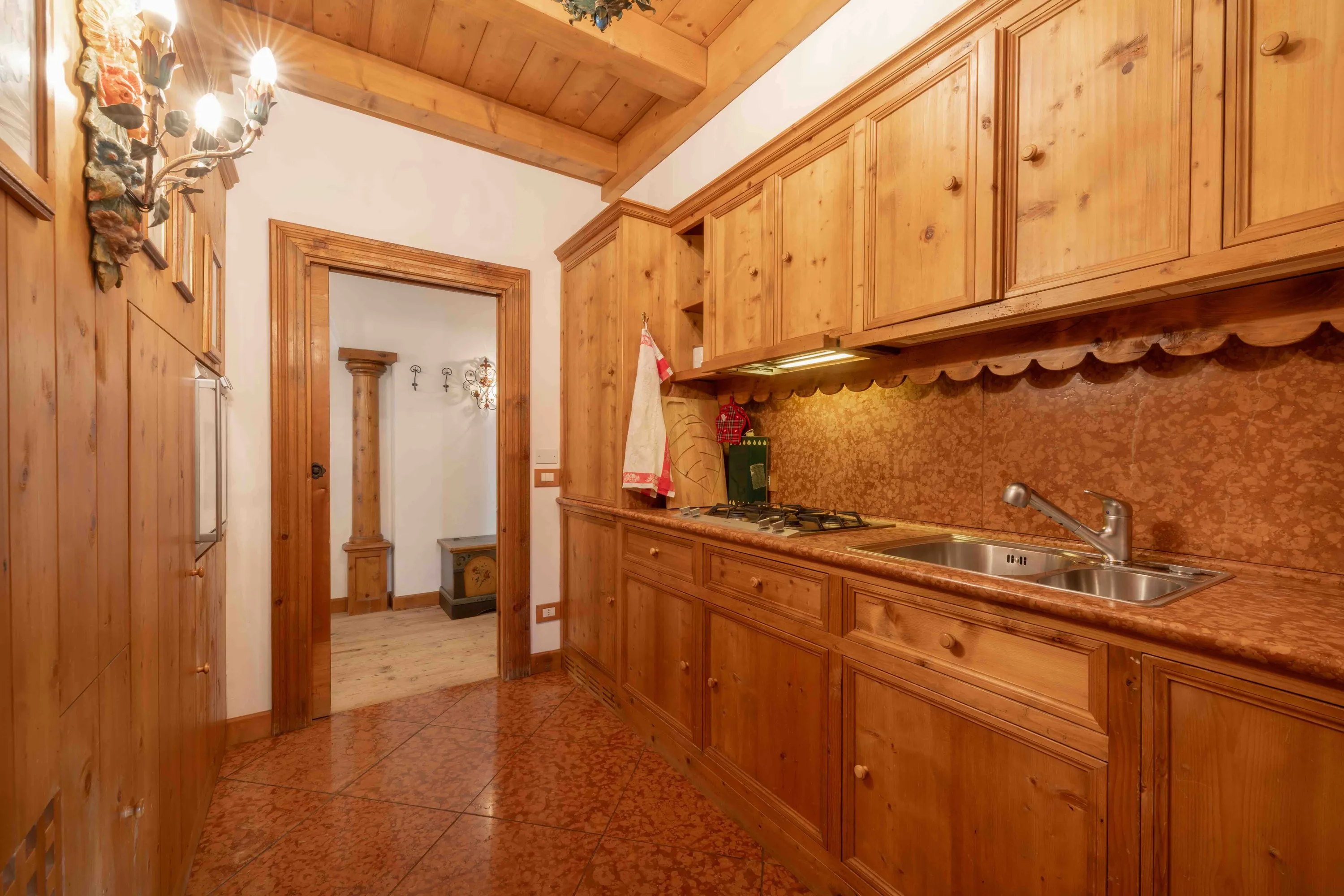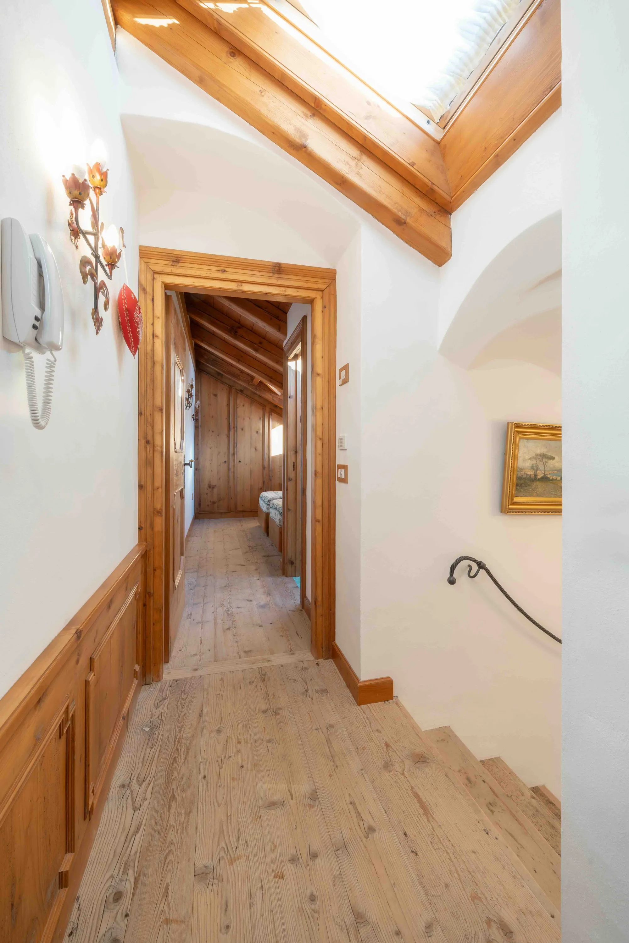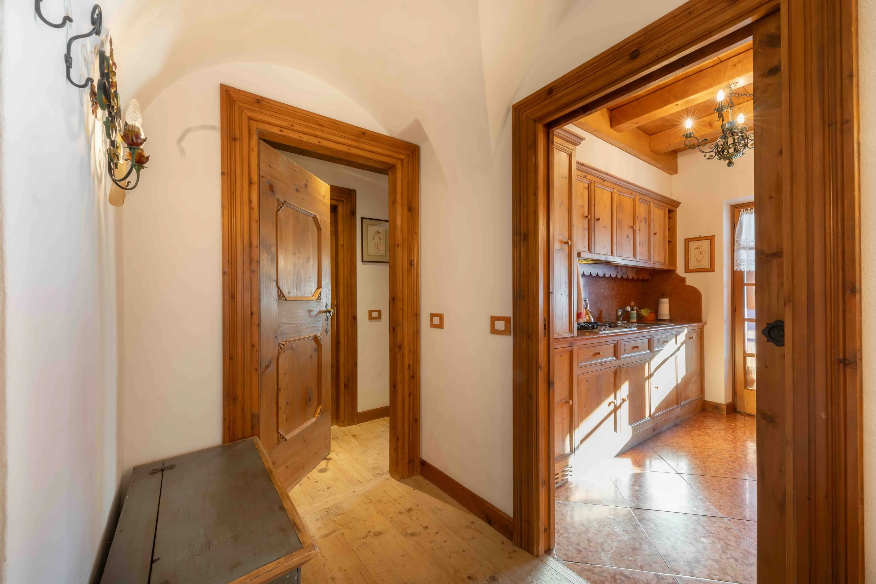 L’ingresso conduce a un accogliente soggiorno, impreziosito da finiture in legno e ampie finestre che catturano la luce naturale. La cucina, separata dal soggiorno, offre un ambiente funzionale e ben organizzato. La camera padronale, spaziosa e raffinata, dispone di un bagno privato e accesso diretto a un terrazzo esclusivo, perfetto per momenti di relax all’aperto, circondati dalla tranquillità delle Dolomiti.